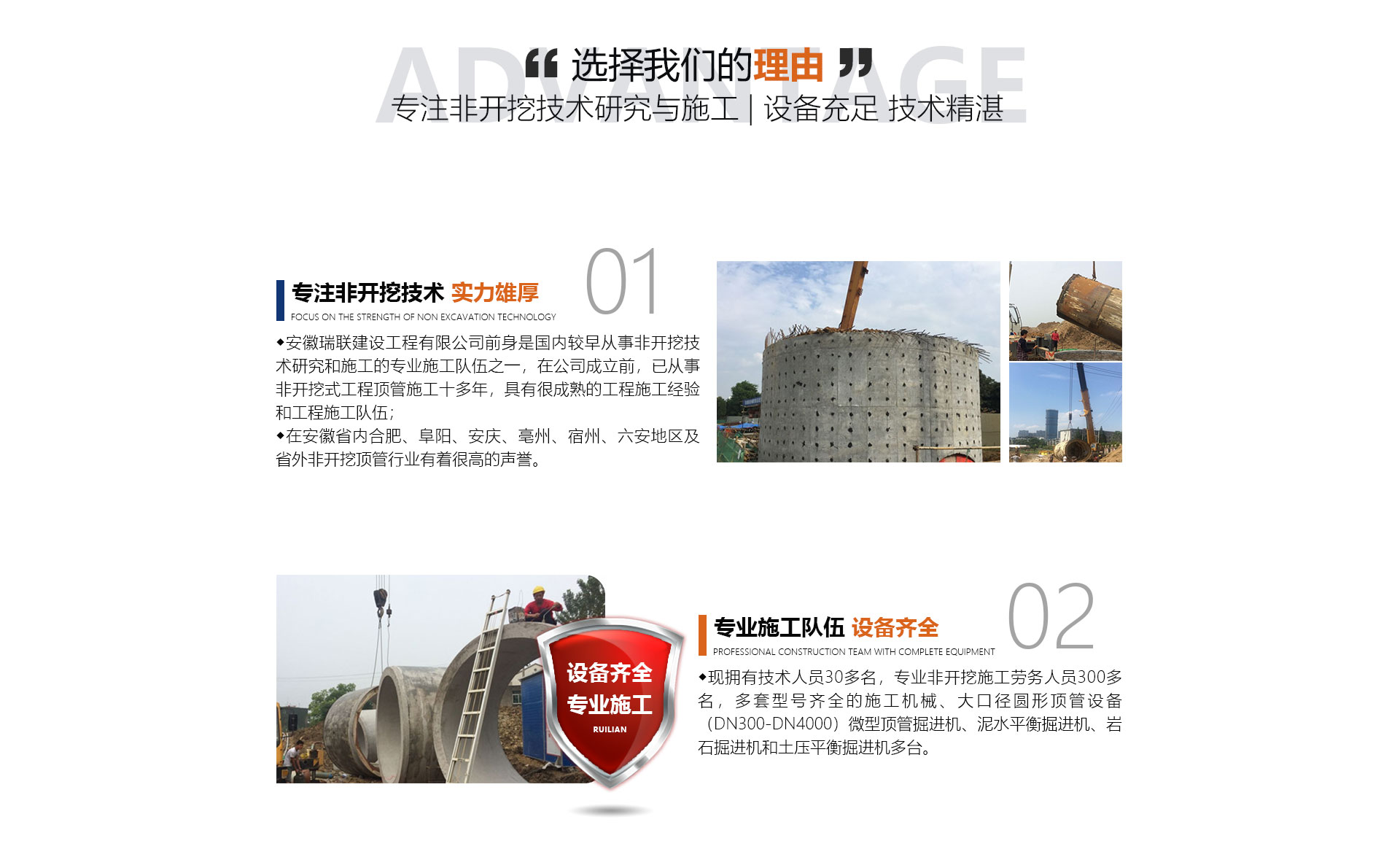 安徽瑞聯(lián)建設(shè)工程有限公司前身是國內(nèi)較早從事非開挖技術(shù)研究和施工的施工隊(duì)伍之一,在公司成立前,已從事非開挖式工程頂管施工十多年,具有很成熟的工程施工經(jīng)驗(yàn)和工程施工隊(duì)伍,在安徽省內(nèi)合肥、阜陽、安慶、亳州、宿州、六安地區(qū)及省外非開挖頂管行業(yè)有著很高的聲譽(yù)。面對日益擴(kuò)大的市場,公司于2014年正式成立,公司擁有勞務(wù)分包及市政公用工程總承包資質(zhì)。公司優(yōu)勢(文字):現(xiàn)擁有中高技術(shù)人員30多名,非開挖施工勞務(wù)人員300...